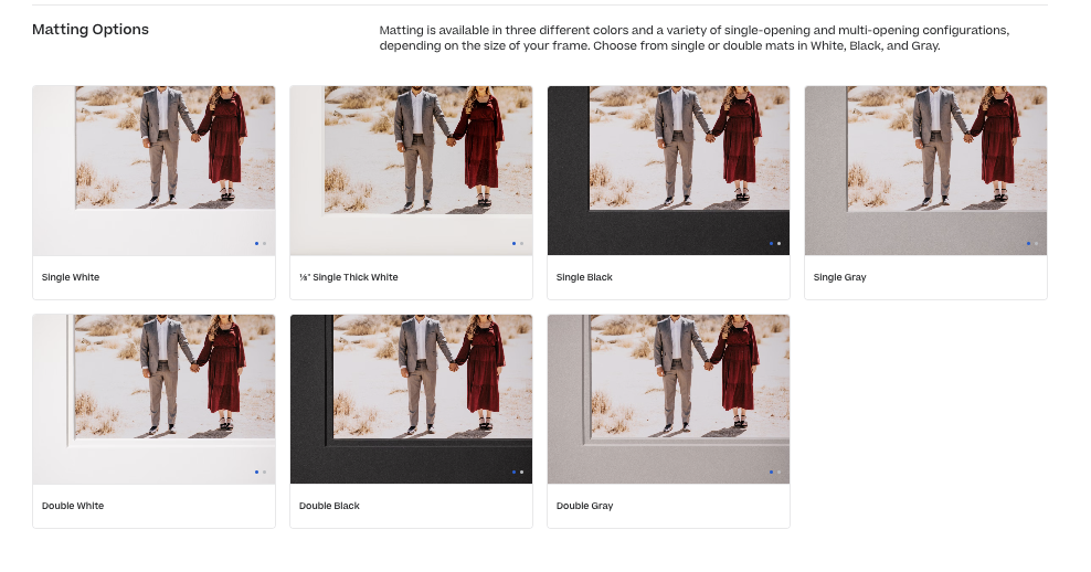 Your images are skillfully framed to preserve them for years to come. Each print is mounted to styrene, to perfectly fit the frame before your choice of moulding is installed. Combine different moulding styles, mats, and acrylic options to create a custom masterpiece.